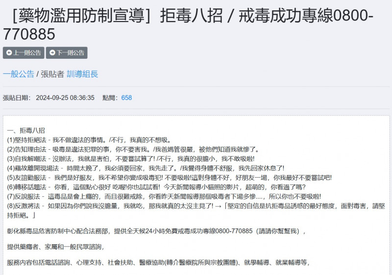 宣導成效 | 透過公告「拒毒八招」(如:開天窗、尋求安慰、自我解嘲等),將抽象的反毒觀念具體化為可執行的生活技能,有效提升學生在面對同儕誘惑時的應變能力與心理韌性。 並明確標示「戒毒成功專線 0800-770885(請請您幫幫我)」,消除學生或家長對戒毒資源的資訊落差,建立「求助不等於受罰」的正確認知,縮短潛在個案與專業輔助間的距離。 |